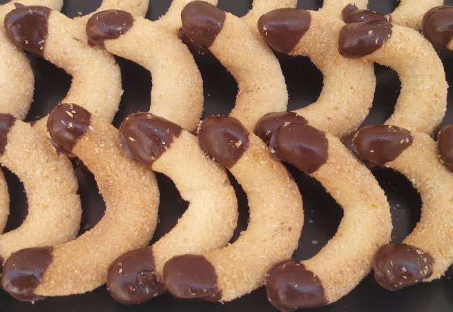 Disposez les demi-lunes sur la plaque. Placez au four à mi-hauteur et faites cuire chaque fournée environ 20 min. Sortez les biscuits du four et laissez-les refroidir.