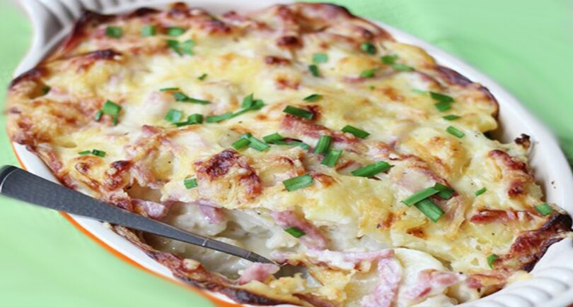 Gratin de chou-fleur, pommes de terre, fromage et jambon