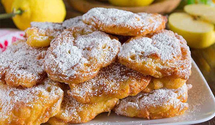 Après cinq minutes, les transférer dans une assiette et les saupoudrer de beaucoup de sucre glace. Les beignets aux pommes parfumés au citron sont prêts à être servis.
