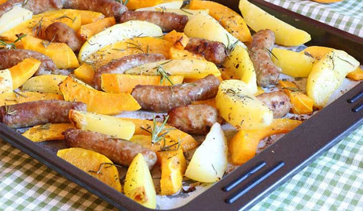 Laver la citrouille et retirer la peau. La couper également en quartiers de taille similaire aux pommes de terre. Puis, les placer sur la lèchefrite, en les mélangeant avec les pommes de terre. Couper la saucisse en morceaux de 5 ou 6 centimètres. Les ajouter aux légumes.